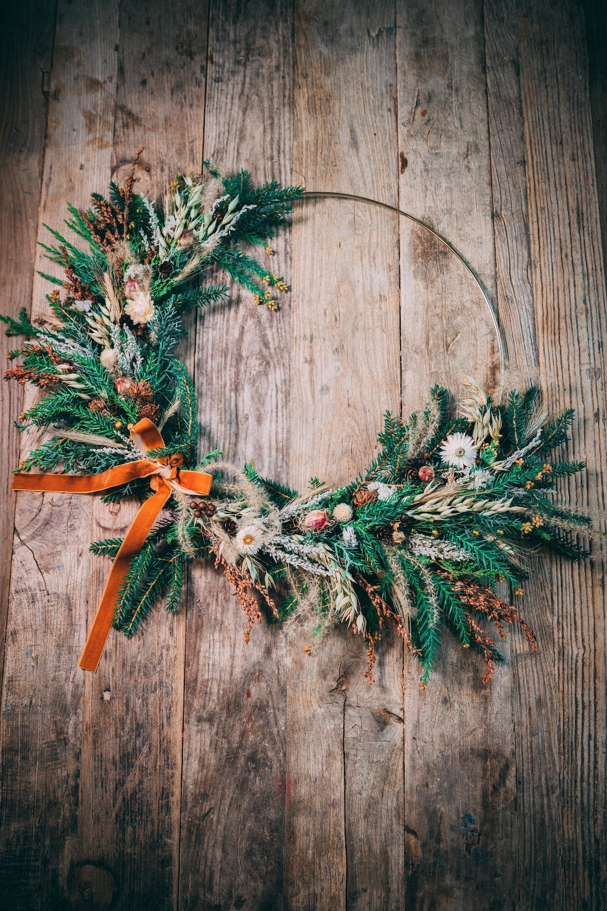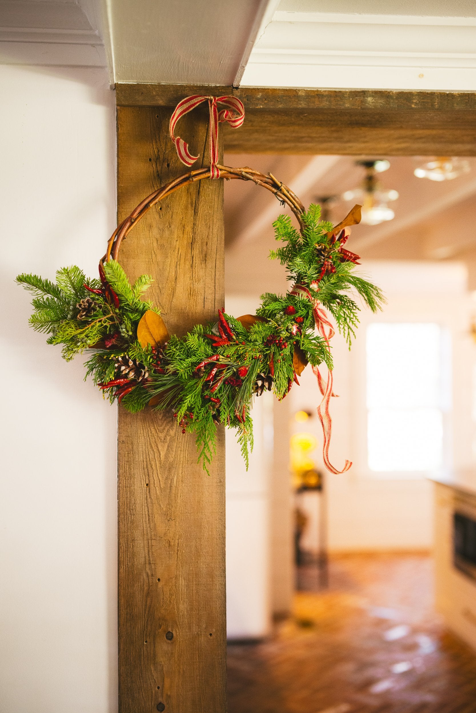 Traditional: a fresh winter wreath adorned with dried florals, ornaments, and ribbon in traditional holiday red, silver and/or gold