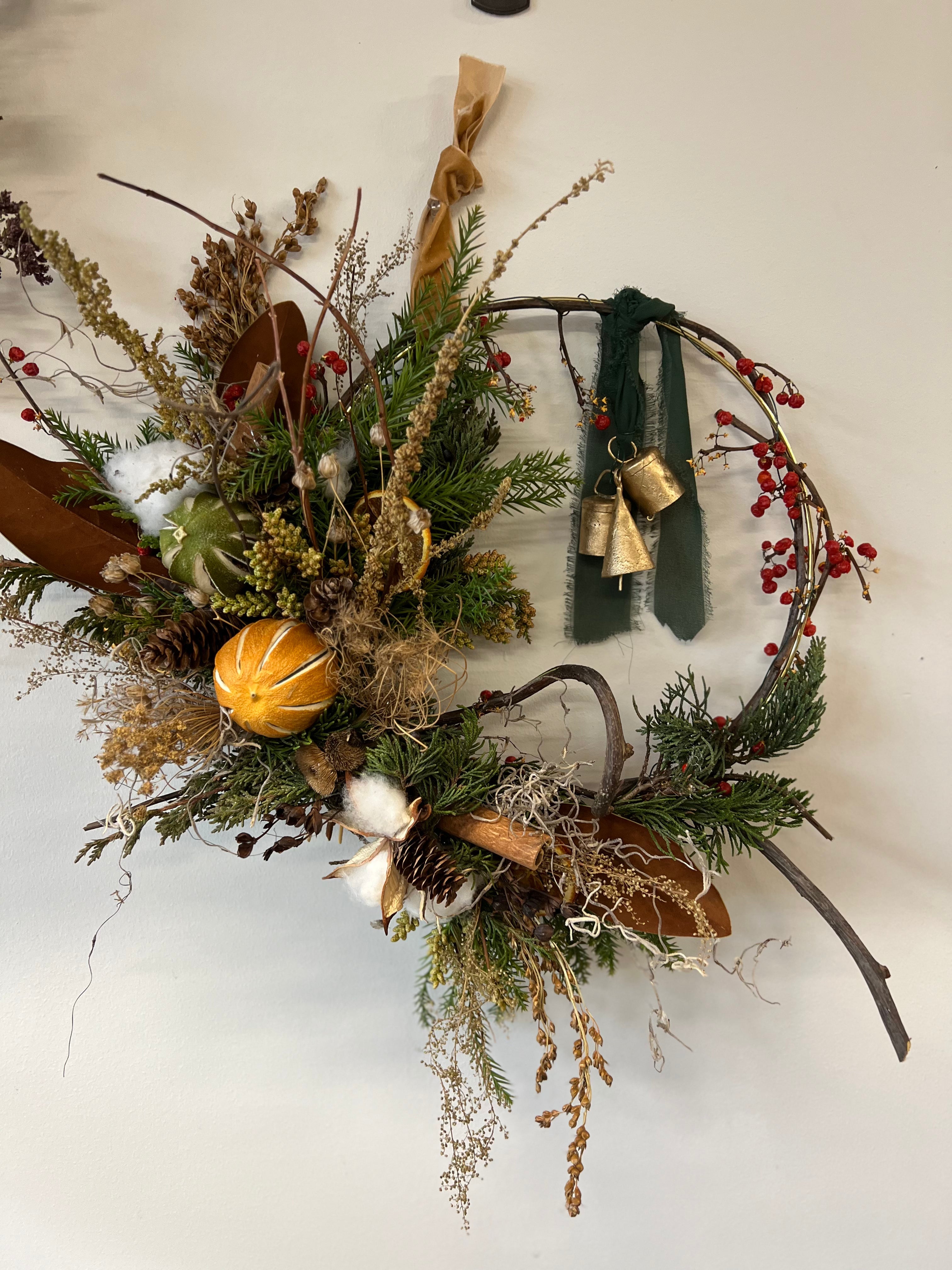 Set on a gold metal or natural grapevine hoop, these everlasting wreaths feature a mix of dried flowers, fresh seasonal winter greens, and additional materials and are designed partially around the ring (note: each design varies and may be a half moon, semi-circle, two opposite clusters, or bottom ring).