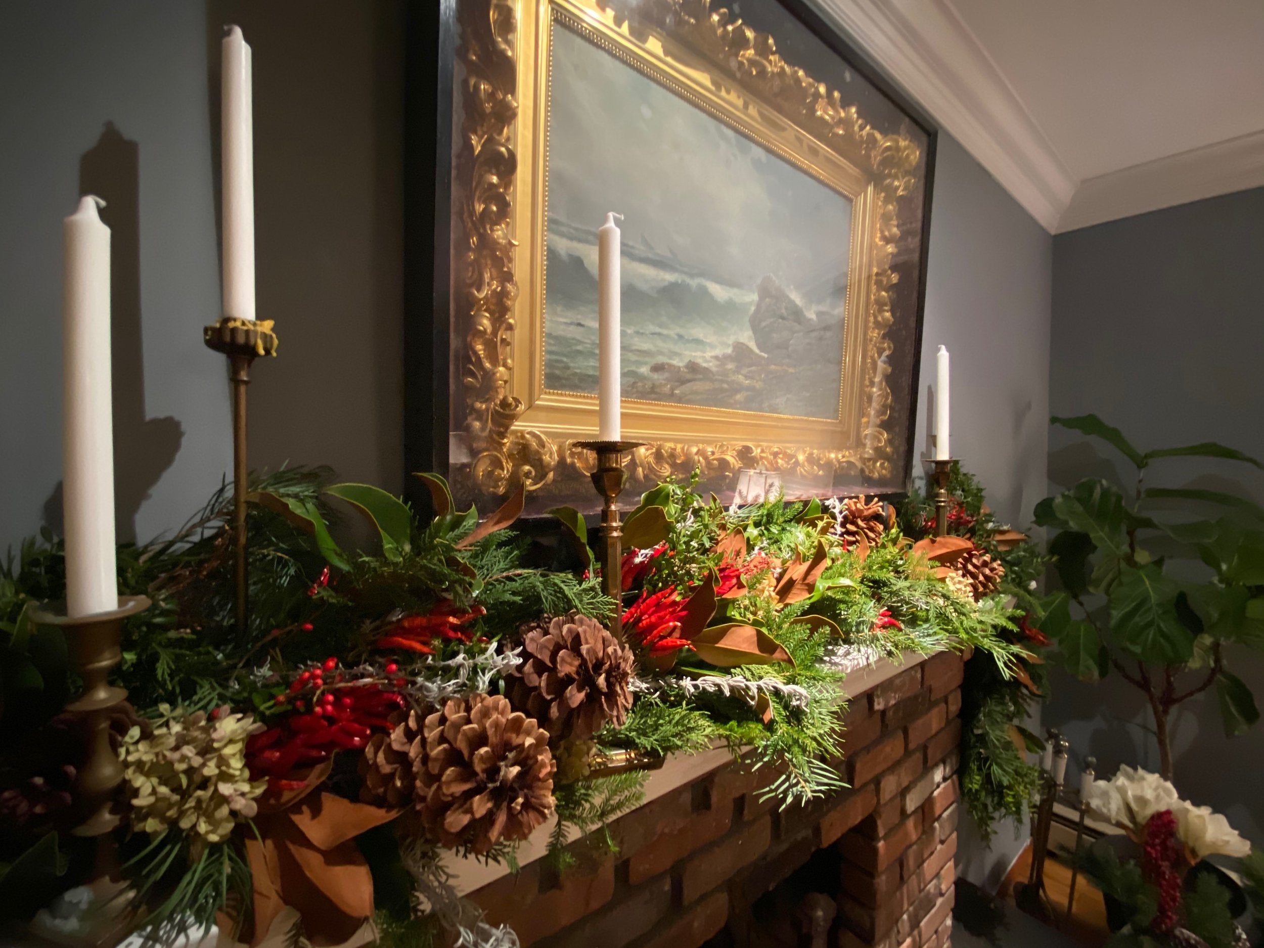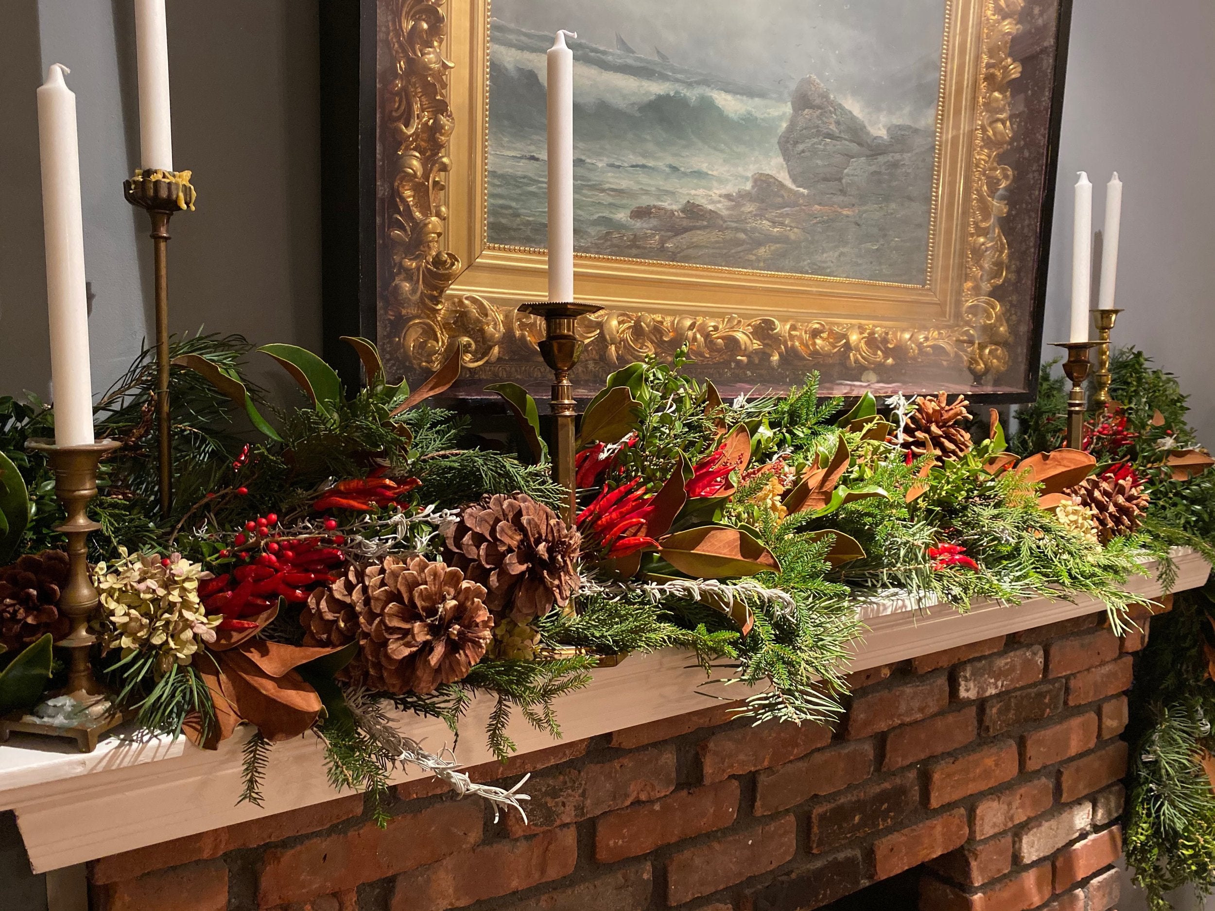 • Traditional: a fresh winter garland adorned with dried florals, ornaments, and ribbon in traditional holiday red, silver and/or gold