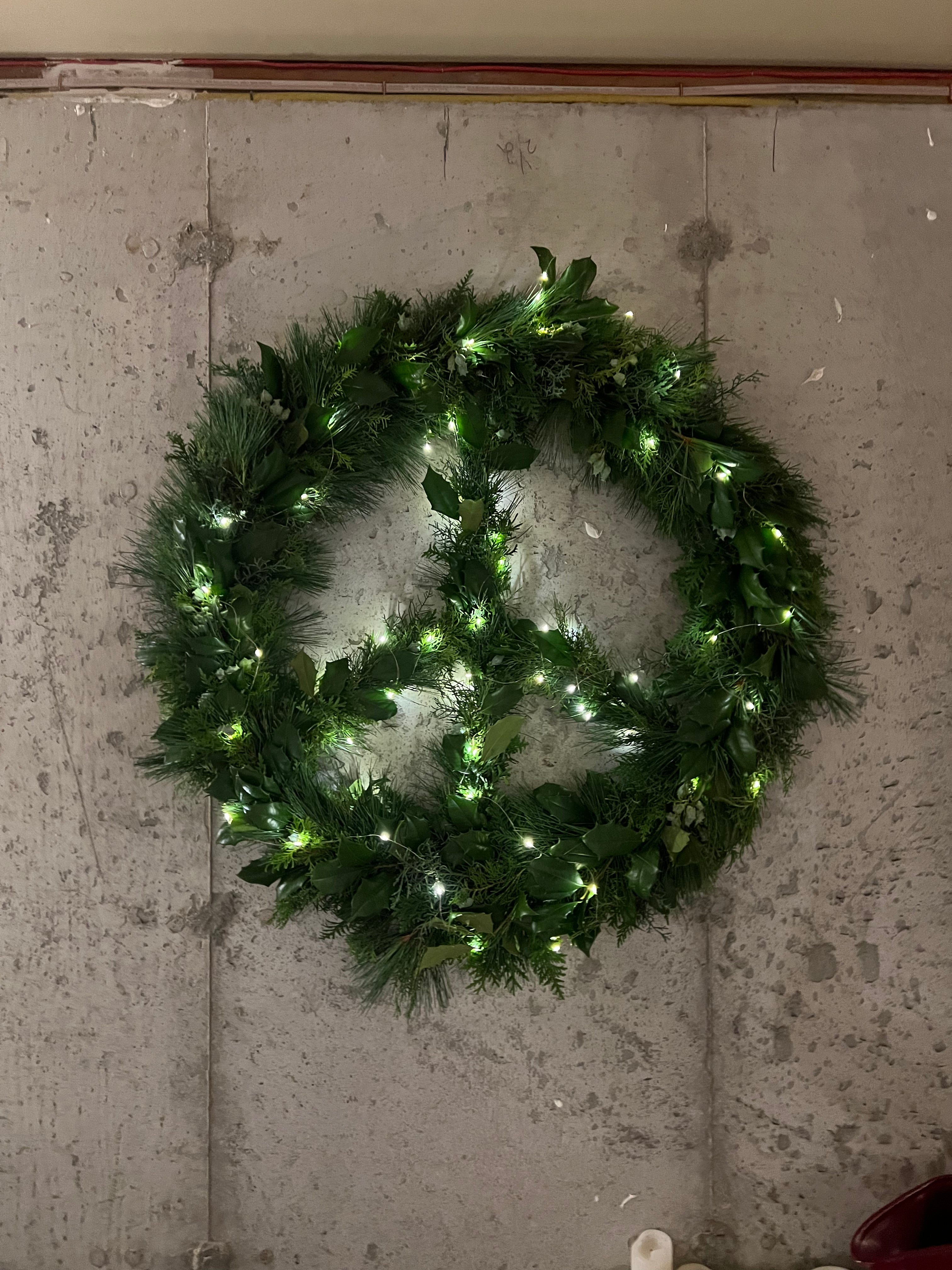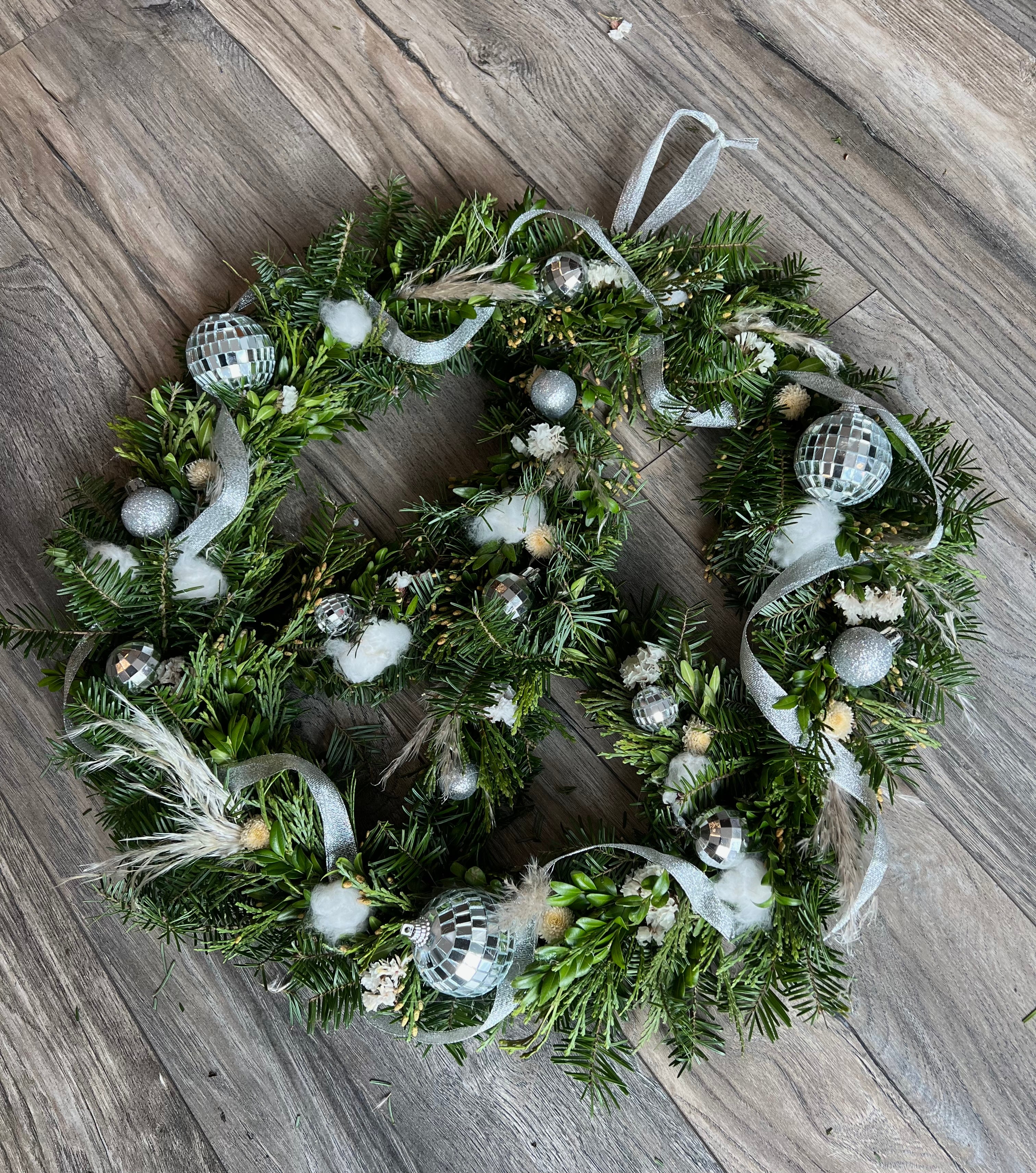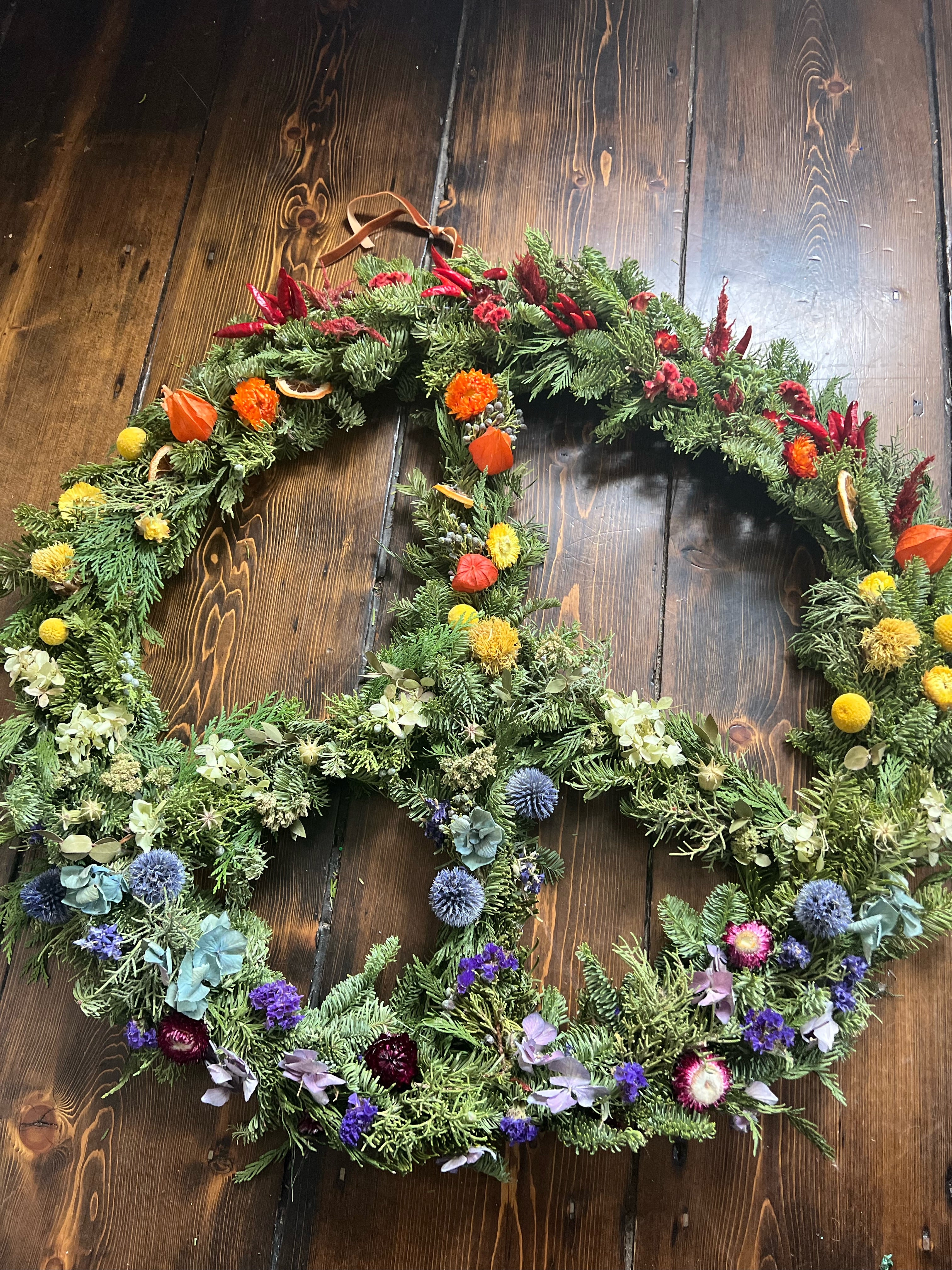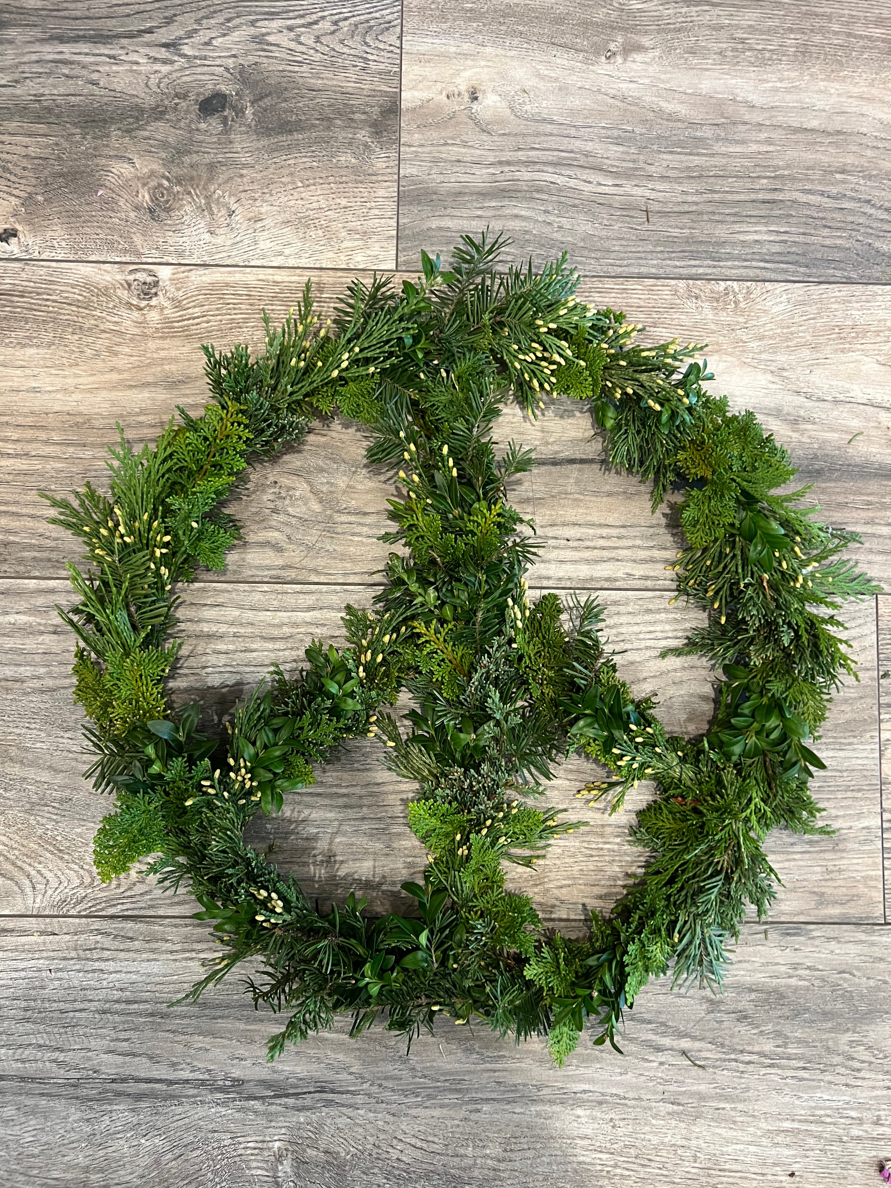 Peace, Love, and Flowers! A seasonal twist on our popular dried floral peace hoops, these peace wreaths are decorated with fresh winter greens, available in two sizes, and can be decorated in various different styles!