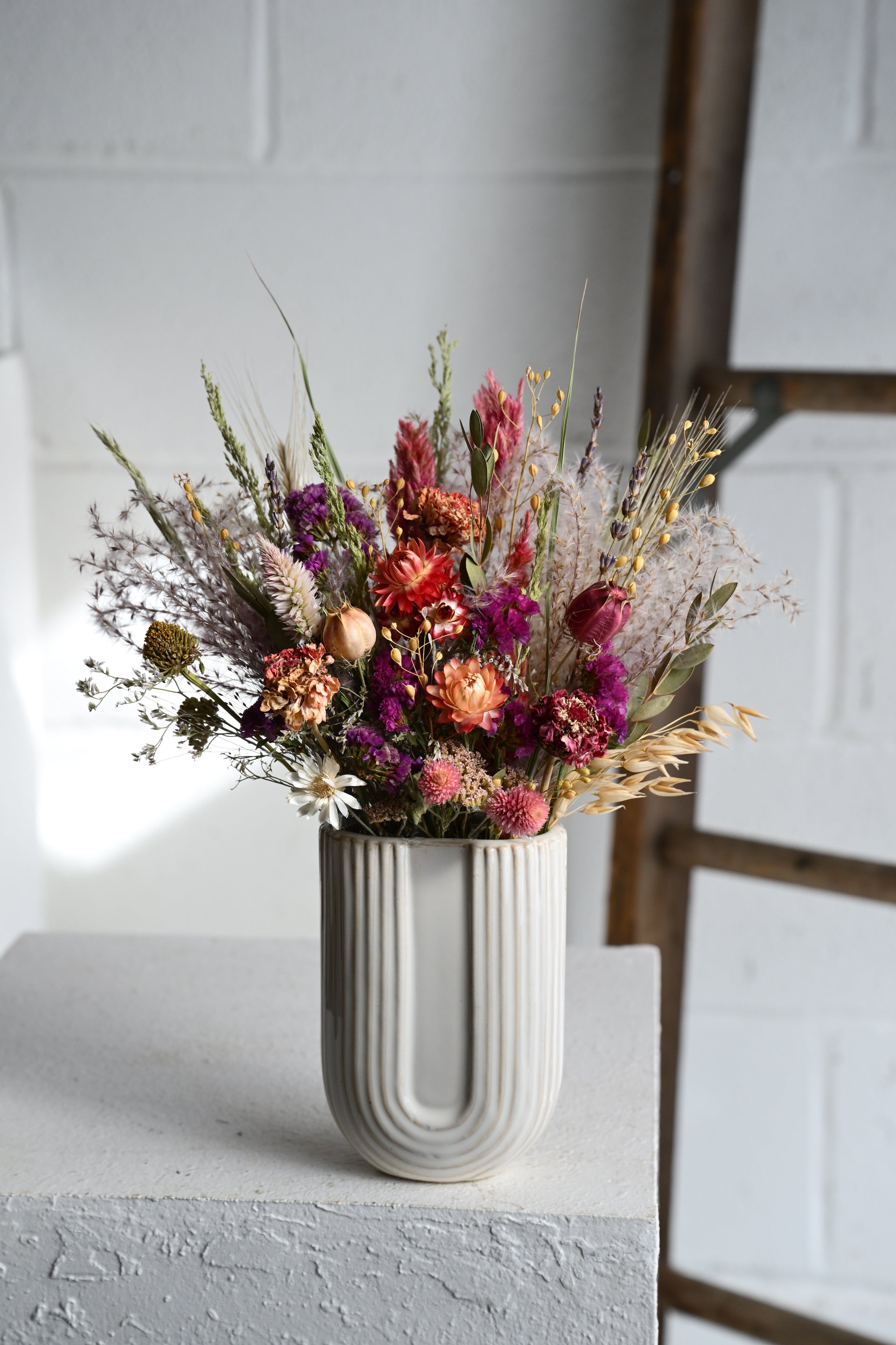 A compact arrangement of naturally dried florals in rich, varied tones, designed in a sculptural ceramic vessel and meant to be enjoyed face-on as a one-sided design. Romy brings together layered color and texture in a smaller, more playful form — gathered closely rather than spread wide, with each stem chosen for its lasting beauty and character.