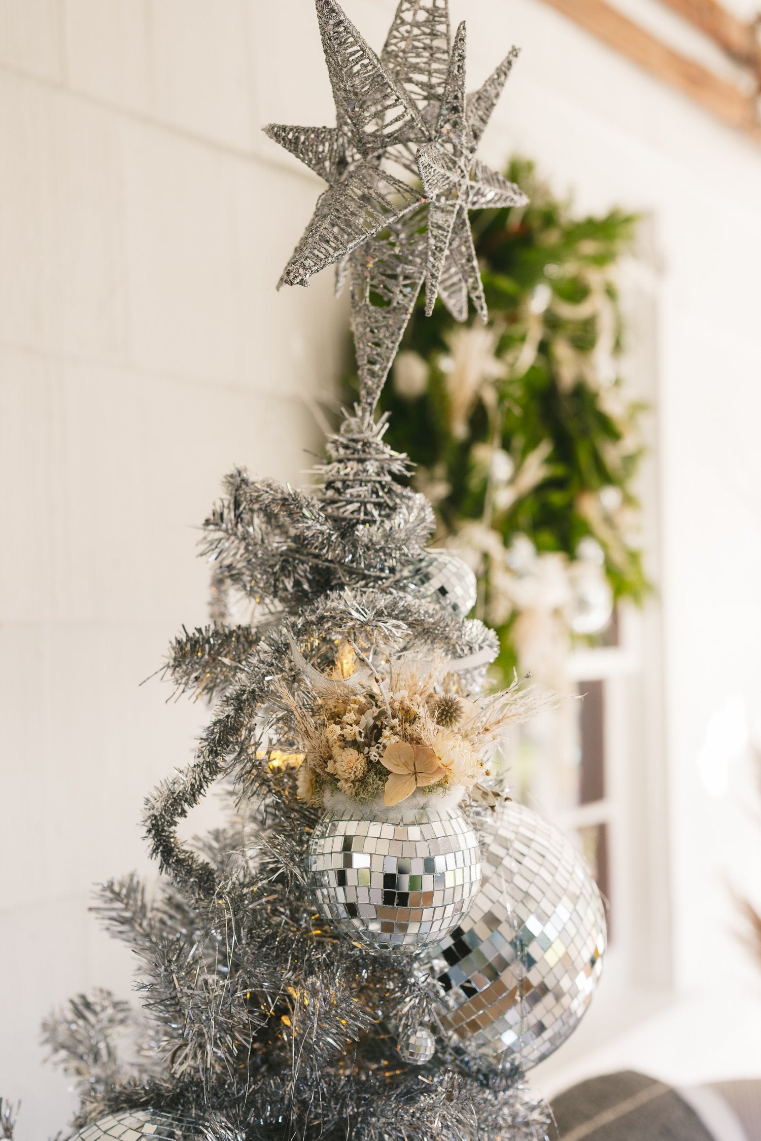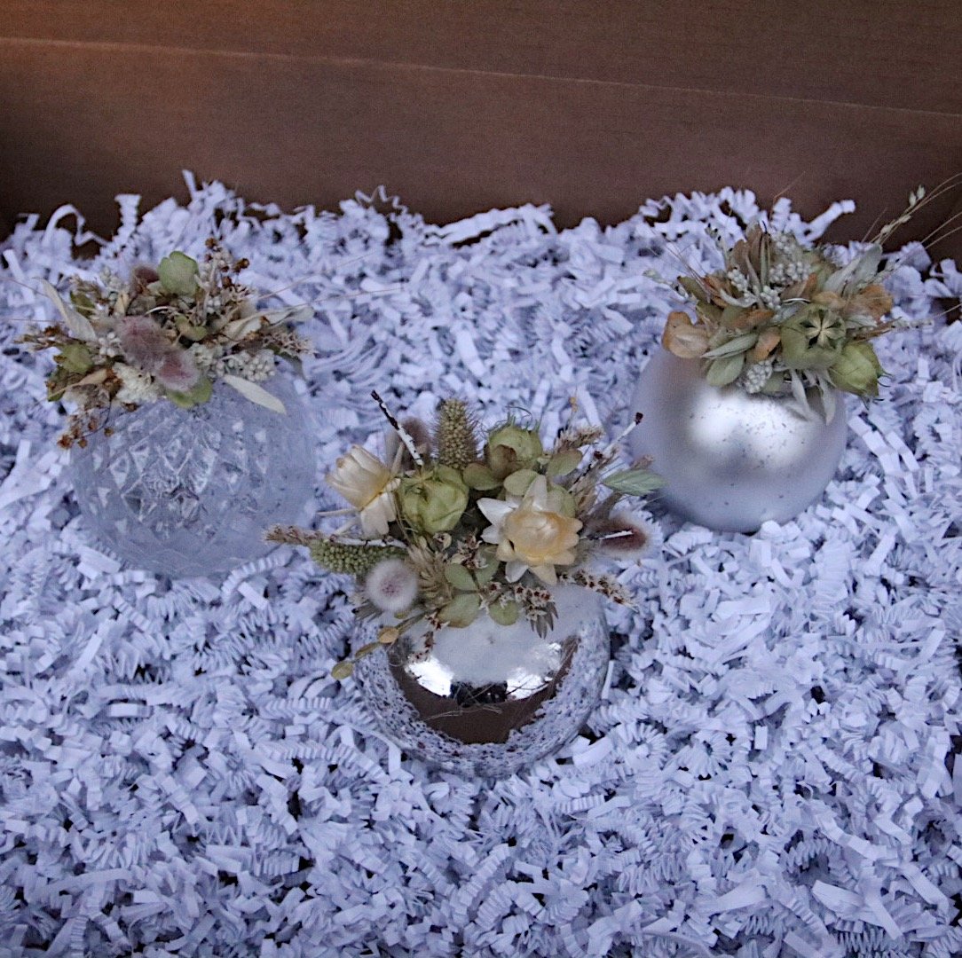 90-minute workshop in which you will decoupage pressed florals and utilize dried florals to decorate a trio of small glass ornaments