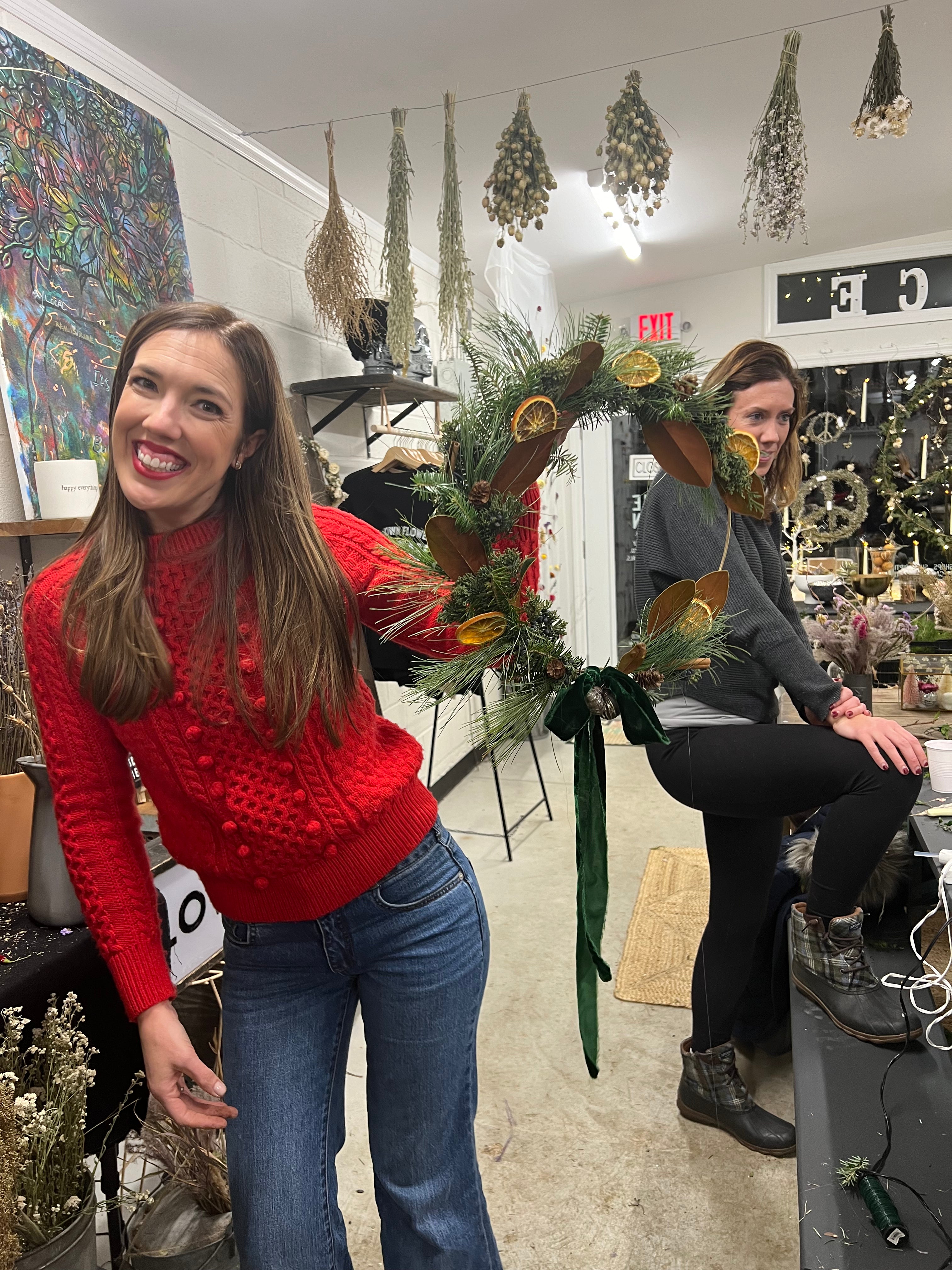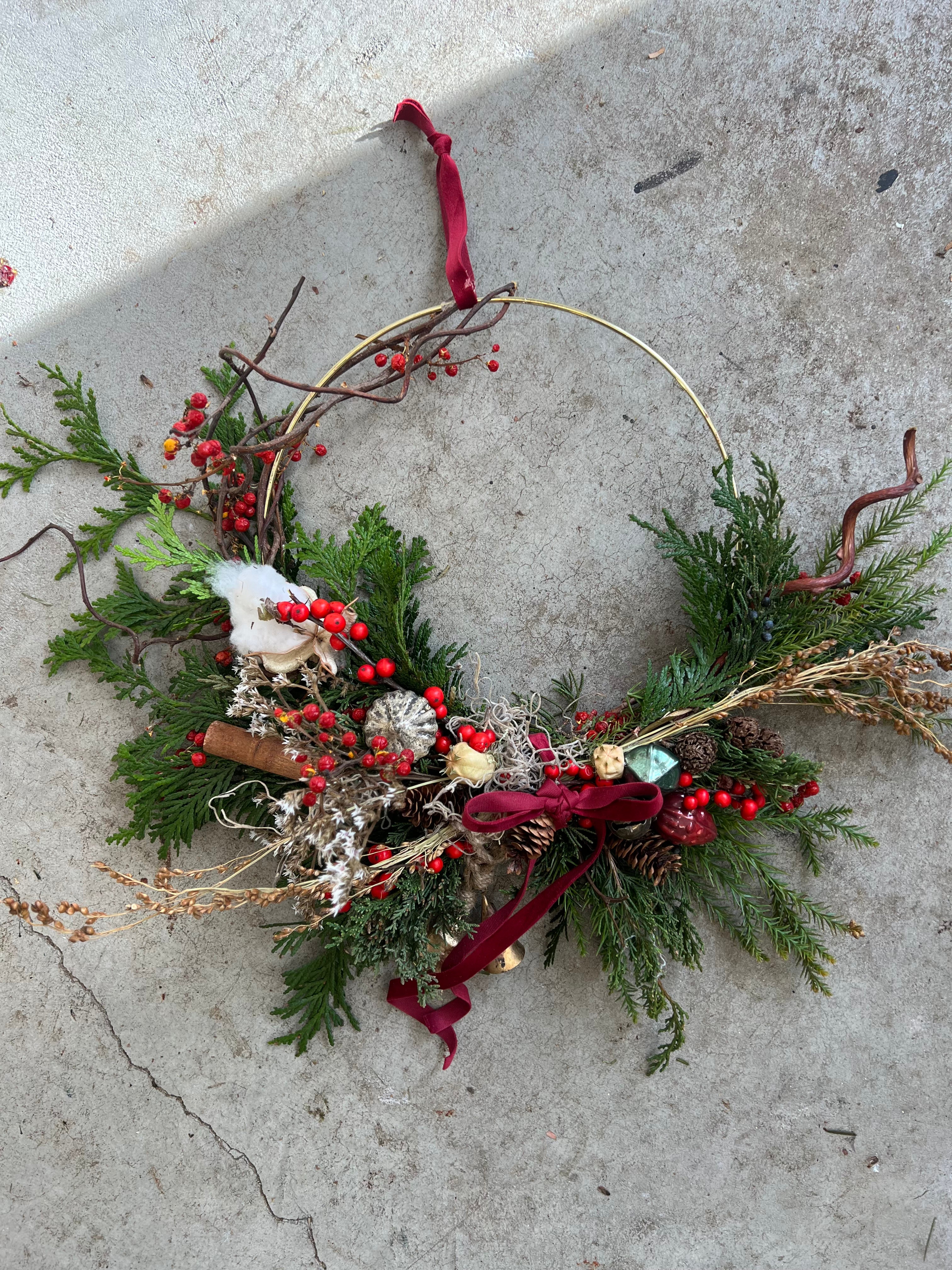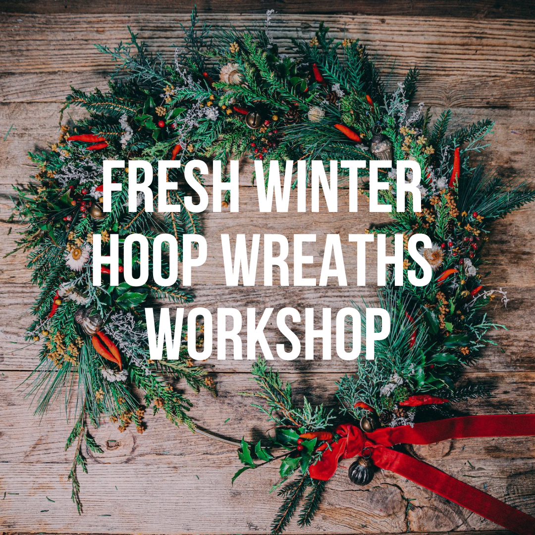 Working with an assortment of carefully-curated winter greens, dried flowers and grasses, you will create a seasonal home adornment reflective of your own personal style to enjoy for the holidays. We will also have an assortment of holiday items to dress up your hoop if you’re feeling more festive.