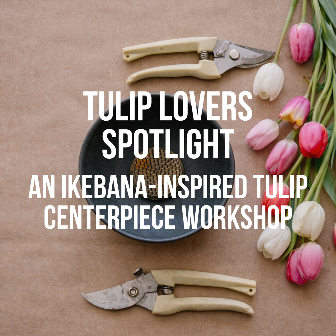 Join us on March 22nd for a special Sunday morning seasonal tulip workshop. Participants will design an ikebana-inspired centerpiece using a white ceramic bowl and metal pin frog, selecting from a curated assortment of specialty tulips flowers sourced from local and regional farms. As you work, you’ll explore ideas of restraint, patience, and presence—allowing each stem to stand on its own while contributing to a cohesive mono-varietal design.
